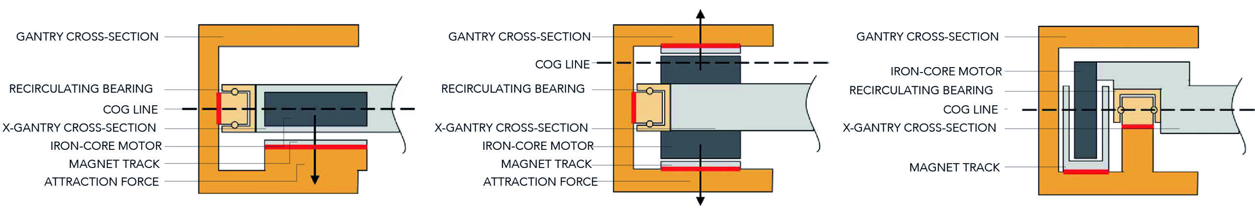 其次考虑了级传动的形式和布置。在这里,最好寻找最佳利用轴承刚度的选项,并最大限度地减少需要昂贵磨削公差的表面数量。某些基于无铁电机(带移动线圈)的完全优化级通过一些复杂的结构来实现这一点,但确保电机、线性轴承和编码器都安装在其c形轮廓的下部。gydF4y2Ba